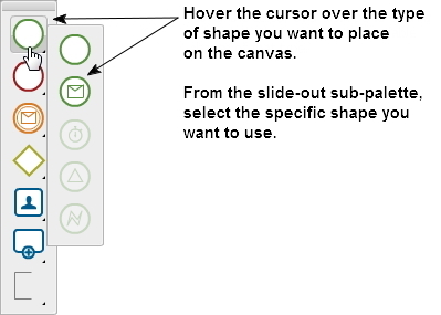 Each icon on the Shapes Palette represents a category of shapes that can be used to draw a process model. Hovering the cursor over an icon opens a sub-palette containing the shapes in that category.